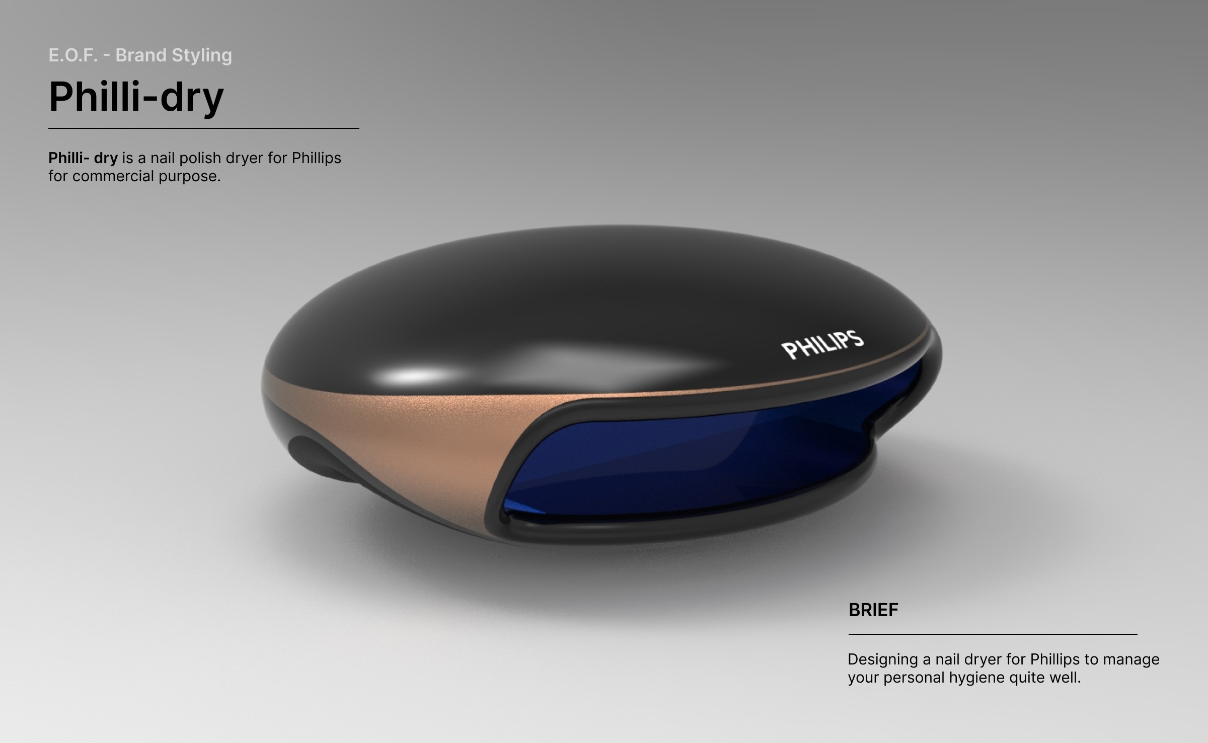 Philli-Dry is a hypothetical nail polish dryer designed to align with Philips’ design language while filling a gap in their product lineup. Through in-depth research and analysis of Philips’ aesthetics, ergonomics, and technology integration, this product was conceptualized to seamlessly blend into their existing portfolio. Designed for commercial use, Philli-Dry features a sleek, user-friendly form, ensuring efficiency, convenience, and an elevated nail care experience.